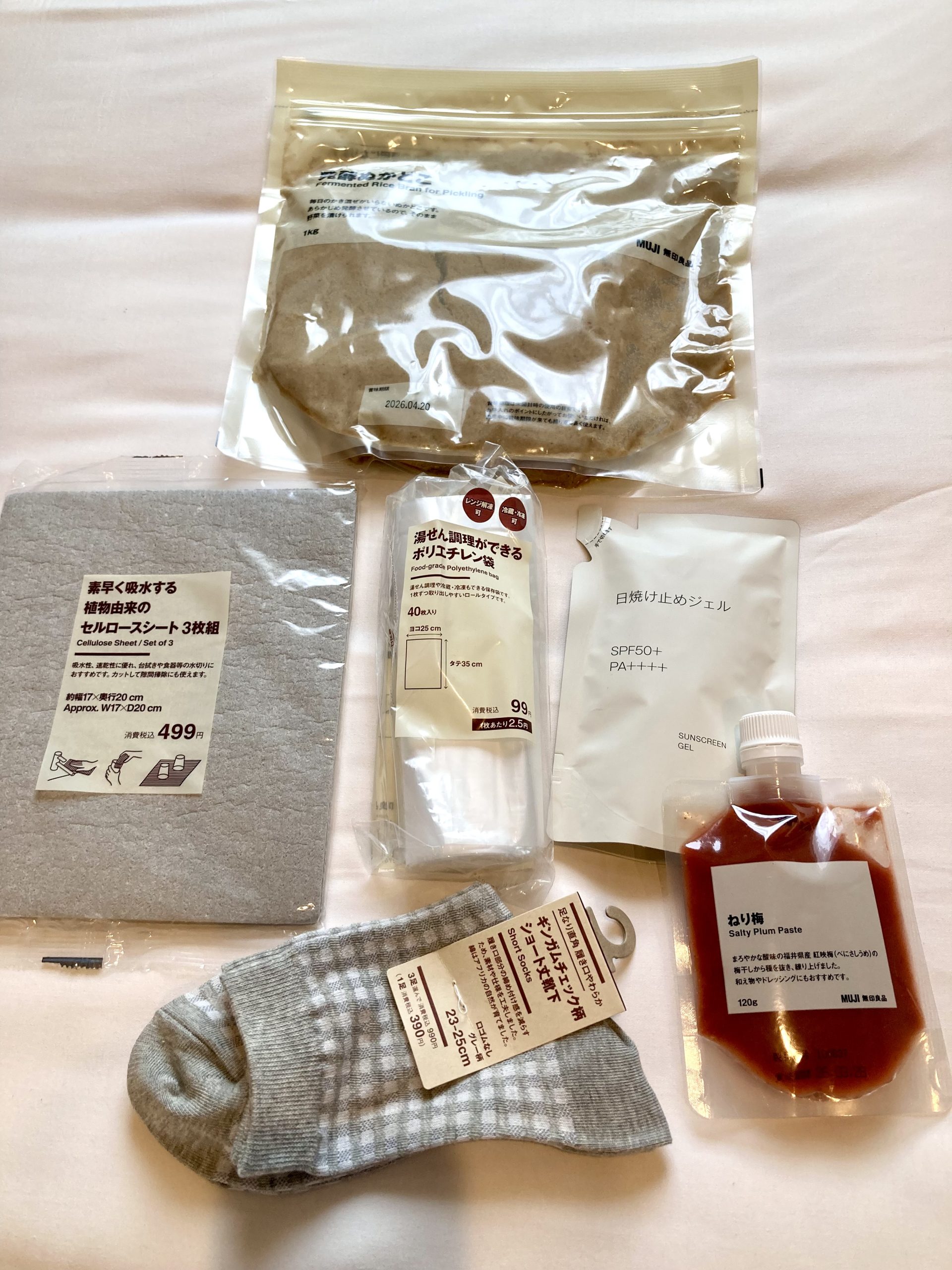 他にも、ねり梅・靴下・日焼け止めジェル・キッチン用消耗品(熱に強いビニール袋と食器の水気とり用セルロースシート)を買いました。